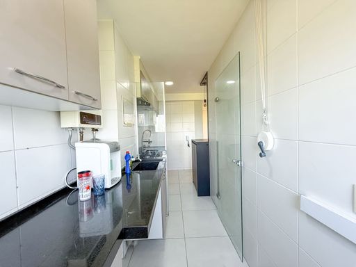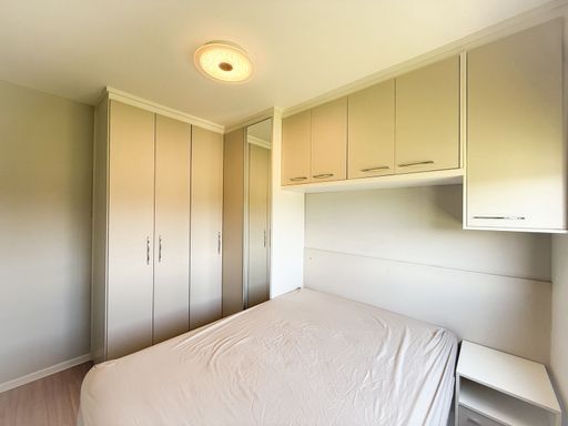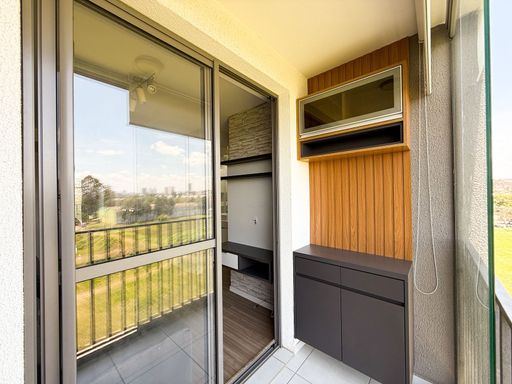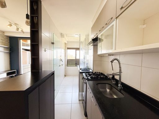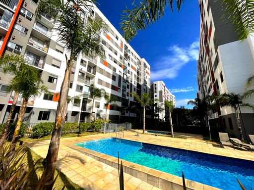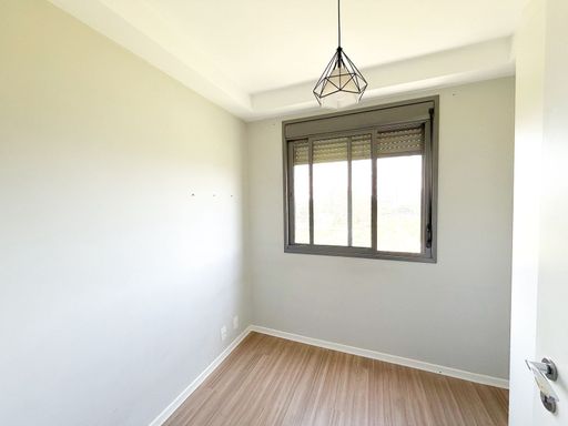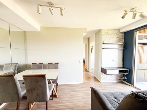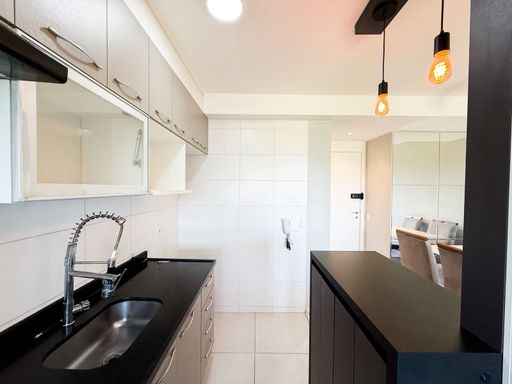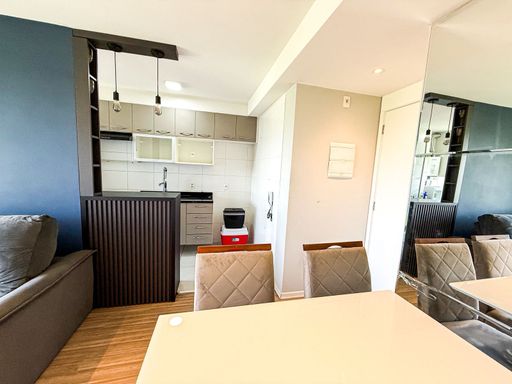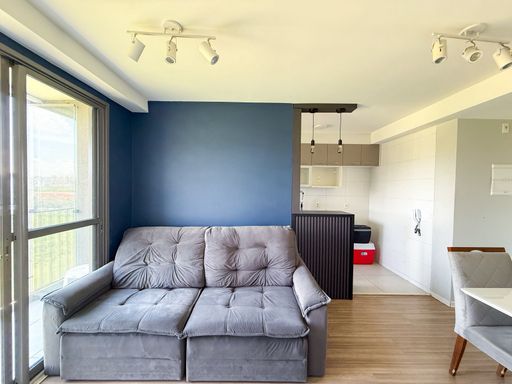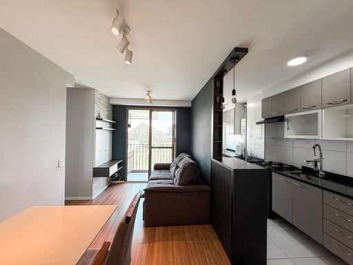 Apartamento a venda com 46m², 2 dormitórios, sala, cozinha, banheiro, varanda com vidros e vaga para 1 carro.