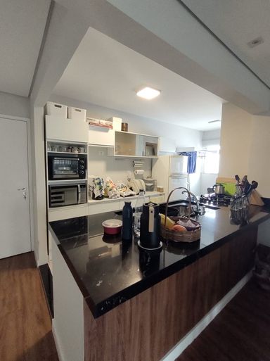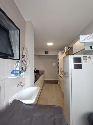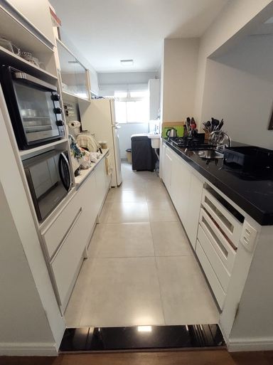 A cozinha é funcional, com ótima ventilação e integração com a área de serviço e a sala, contando com uma linda ilha.
